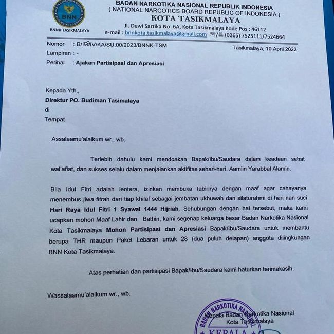 "Kami segenap keluarga besar Badan Narkotika Nasional Kota Tasikmalaya mohon partisipasi dan apresiasi bapak/ibu/saudara untuk membantu berupa THR maupun paket Lebaran untuk 28 anggota di lingkungan BNN Kota Tasikmalaya," kutipan bagian akhir dalam surat.