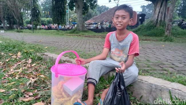 Namun, mata detikJabar terpaku saat melihat seorang bocah yang sedang berkeliling sambil membawa wadah berisikan kerupuk. Bocah tersebut yakni Riski Nazril Risan (13).