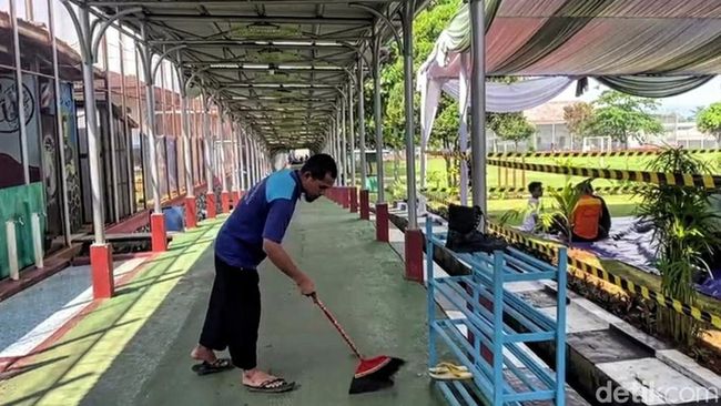 Dedi (32) terlihat menyapu lantai lorong area dalam Gedung Lembaga Pemasyarakatan (Lapas) Kelas II B Warungkiara, Kabupaten Sukabumi. Sesekali matanya melirik ke gazebo lapas, tempat berkumpulnya keluarga warga binaan.