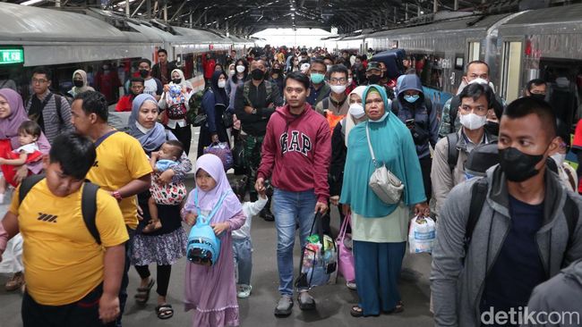 Pantauan detikJabar di Stasiun Bandung, Selasa (25/4/2023) pukul 15.30 WIB, pintu kedatangan ramai disesaki pemudik yang kembali dari kampung halaman.