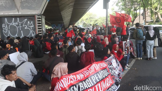 Pantauan detikJabar, Senin (1/5/2023) seratusan buruh yang tergabung dalam Konfederasi Serikat Nasional, Federasi Serikat Buruh Militan, Lion dan lainnya bergantian melakukan orasi di lokasi tersebut.