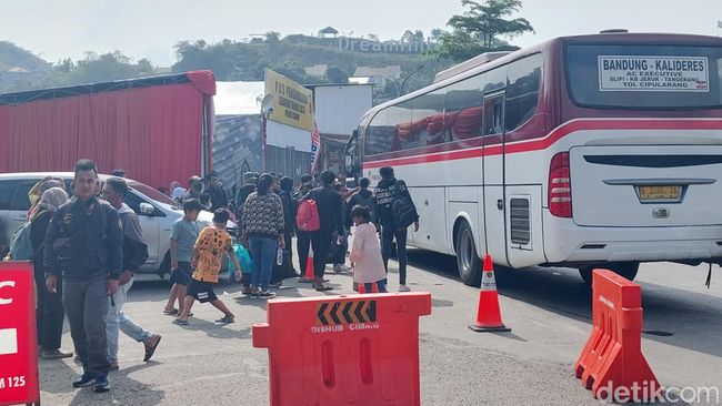 Arus balik usai di penghujung libur panjang Lebaran tahun 2023 ini masih terlihat di Rest Area KM 125 Tol Purbaleunyi, Kota Cimahi, pada Senin (1/5/2023). Pantauan detikJabar pada pukul 15.00 WIB, kepadatan terlihat di pool bus.