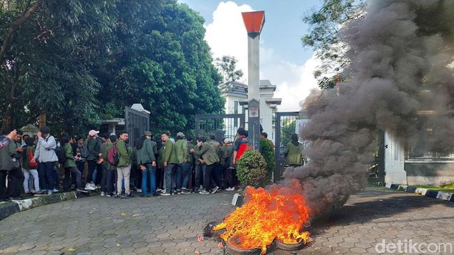 Kobaran api mengepulkan asap hitam terlihat dari depan kantor Wali Kota Cimahi. Sumbernya yakni ban yang dibakar sekelompok mahasiswa yang sedang berunjuk rasa pada Selasa (2/5/2023) sore.