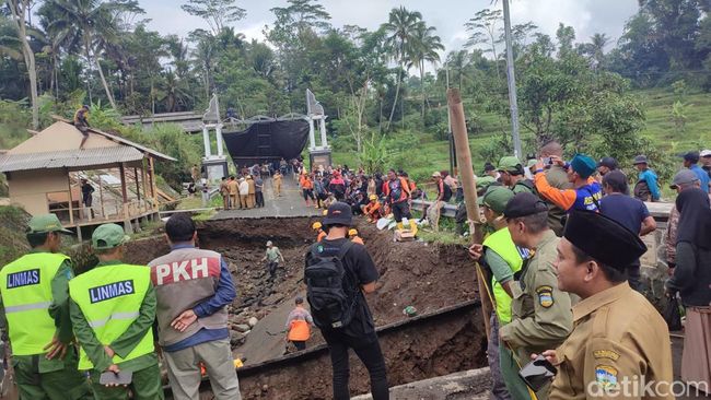 Tak lama berselang, seluruh bagian jalan penghubung jembatan amblas terbawa longsoran. Warga yang sempat mendekat langsung berlarian karena khawatir terbawa longsor.