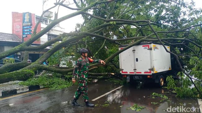 "Kita terima laporan 15.20 WIB, bahes di Jalan Sudirman ada pohon tumbang menimpa mobil boks, kami langsung meluncur dengan anggota," kata Totong kepada detikJabar.
