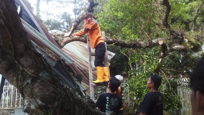 Pohon tumbang menimpa atap bangunan makam sesepuh Sumedang yang juga mantan Bupati Sukabumi Raden Adipati Aria (RA.A) Soeria Danoeningrat di Komplek Pemakaman Gunung Puyuh, Kabupaten Sumedang.