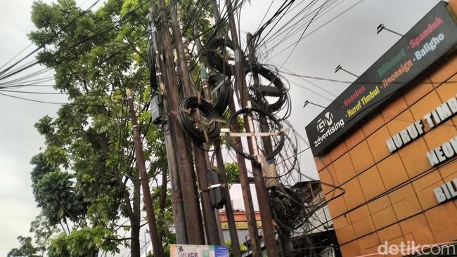 Pantauan detikJabar, Selasa (16/5/2023) sore, kabel udara melintang di sepanjang Jalan Ahmad Yani mulai dari persimpangan Jalan Supratman hingga ke kawasan Pasar Cicadas.