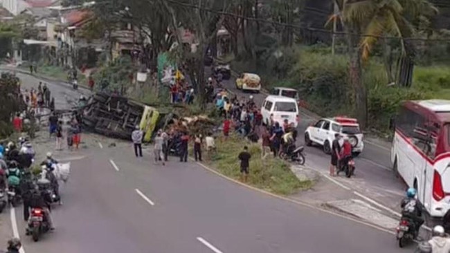 "Pada waktu di turunan sebelum jalan cagak itu rem blong. Sehingga dia tidak bisa mengendalikan, kemudian menabrak pohon yang ada di sekitar pembatas jalan ke arah Tasik dan Garut," katanya.