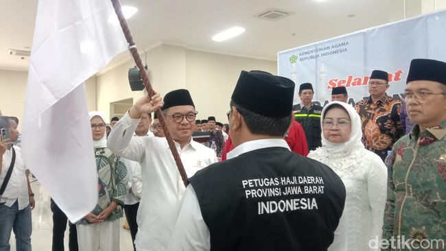 Wakil Ketua Komisi VIII DPR RI Ace Hasan melepas kloter pertama haji di asrama haji Indramayu, Minggu (28/5/2023). Sebanyak 366 calon jemaah haji dilepas dari asrama haji Indramayu.