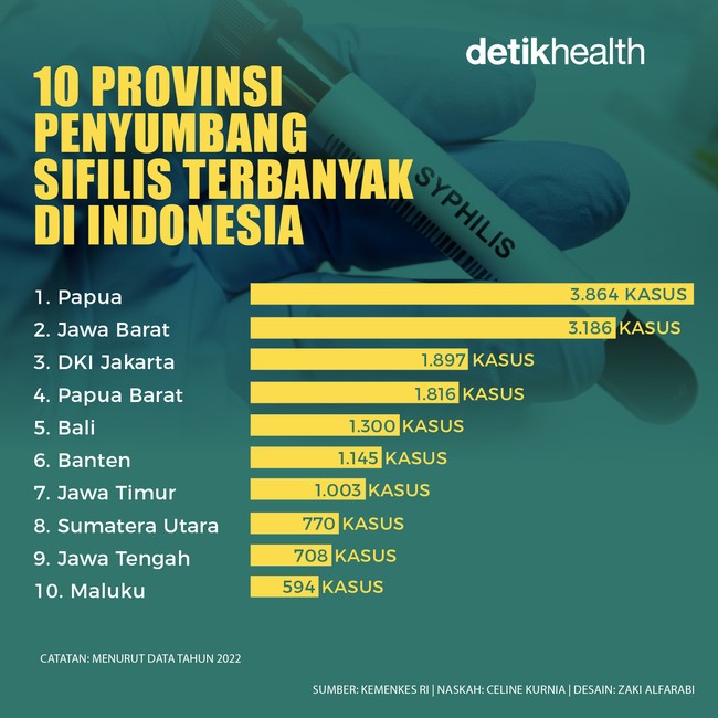 Bandung - Jawa Barat menjadi daerah tertinggi kedua di Indonesia yang melaporkan kasus terpapar sifilis atau 'raja singa'. Pada 2022, tercatat sebanyak 3.186 kasus ditemukan berdasarkan laporan yang diterima Kementerian Kesehatan.
