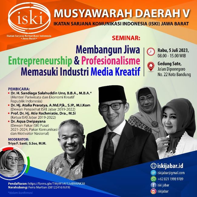 Musda V ISKI Jabar 2023 yang menurut rencana akan digelar di Gedung Sate Kota Bandung tersebut, serangkai dengan Seminar Membangun Jiwa Entrepreneurship dan Profesionalisme Memasuki Industri Media Kreatif".