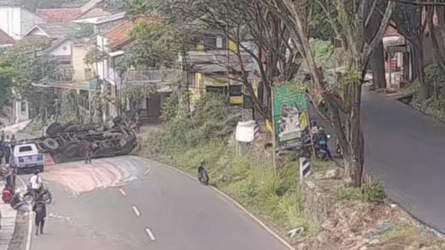 Peristiwa kecelakaan tunggal melibatkan truk bermuatan keramik. Truk tersebut terguling di Jalan Cagak, Nagrek, Kabupaten Bandung pada Senin (19/6/2023) dini hari sekitar pukul 03.00 WIB.