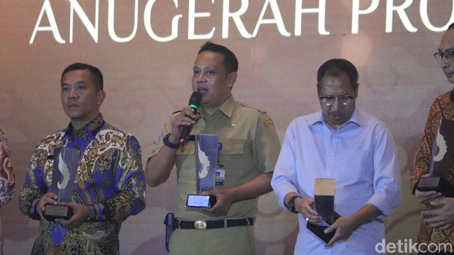 Ajang detikJabar Awards digelar di The Trans Luxury Hotel Bandung, Selasa (20/6/2023). Pemberian piala diserahkan oleh Ina Sembiring sebagai Direktur Bisnis detikcom yang diterima oleh Sekretariat DPRD Kota Bandung Eka Taufik Hidayat.