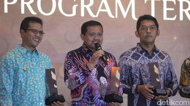 Ajang detikJabar Awards digelar di The Trans Luxury Hotel Bandung, Selasa (20/6/2023). Pemberian piala diserahkan oleh Latif Harnoko selaku Direktur Transmedia dan diterima Bupati Sumedang Dony Ahmad Munir.