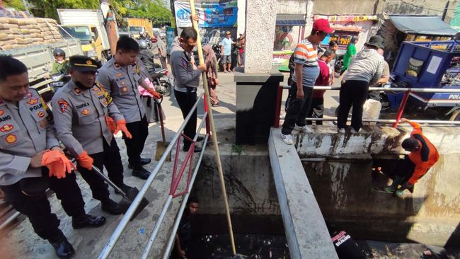 Personel kepolisian yang diterjunkan tanpa jijik membersihkan sampah-sampah berbagai bentuk, seperti ranting pohon, plastik bekas makanan, dan sampah lainnya.