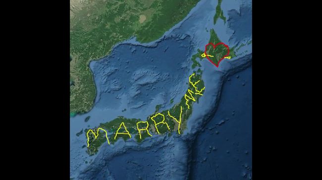 Perjuangan luar biasa dilakukan seorang pria Jepang bernama Yasushi Takahashi untuk melamar sang kekasih. Dia rela melakukan perjalanan sejauh 6.500 km melintasi Jepang bersama pelacak GPS sehingga membuat tulisan 'Marry Me' dan gambar hati terpanah.