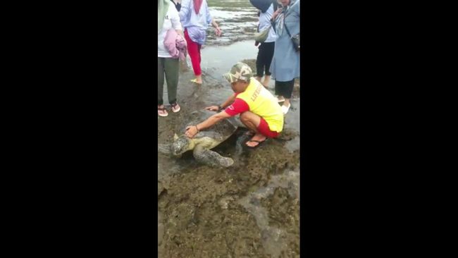 "Penyu ini termasuk hewan dilindungi karena sudah langka. Jadi kami evakuasi didorong ke laut lagi biar habitatnya terjaga dari kepunahan," tambah Rahmat.