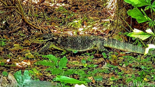 Baru beberapa meter masuk ke rimbunan pohon, benar saja seekor biawak muncul. Tubuhnya gemuk dengan panjang sekitar 1 meter lebih, ia terlihat santai berjalan dengan tubuhnya yang kekar hewan itu awalnya terlihat cuek dengan kehadiran tim detikJabar dan warga yang ikut dalam perjalanan.