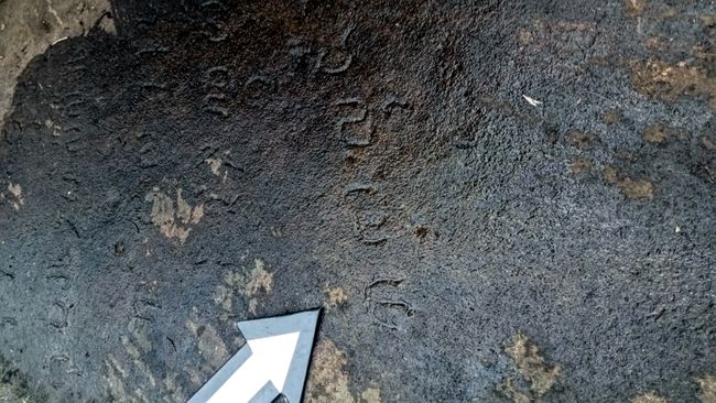 Di atas batu berukuran besar itu terdapat cetakan telapak tangan dan aksara kuno.