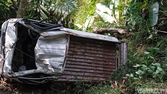 Sebuah mobil pikap terjun ke jurang sedalam 70 meter usai selip dan tak kuat menanjak jalan batu yang menghubungkan Desa Mekarsari dan Wangunjaya Kecamatan Kecamatan Naringgul, Kabupaten Cianjur, Rabu (26/7/2023).