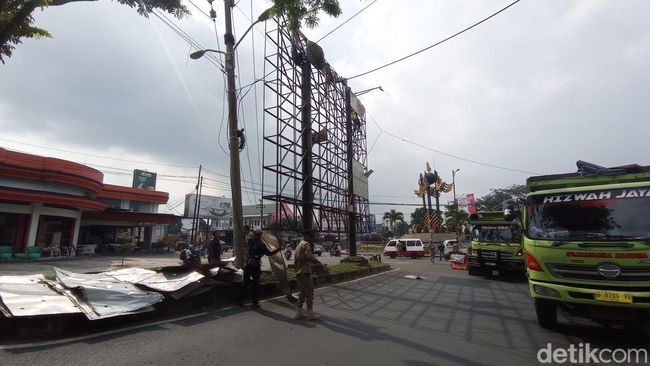 Media pemasangan reklame berupa kontruksi besi dengan lebar lebih dari 5 meter itu dibongkar oleh petugas karena melanggar aturan. Lokasinya yang berada di Simpang Empat Linggajaya Kecamatan Mangkubumi sempat menarik perhatian masyarakat yang melintas.