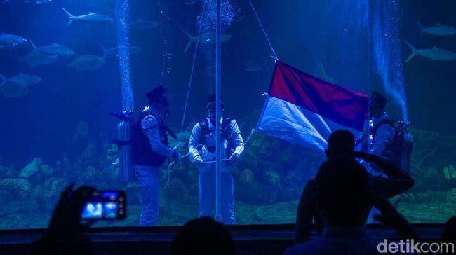 Keunikan dalam pengibaran bendera dalam akuarium, meskipun menggunakan alat selam, petugas tetap berpakaian putih layaknya Paskibra.