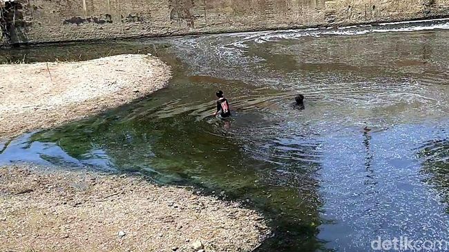 Terlihat pada Jumat (18/8/2023) pagi, beberapa warga tengah sibuk mengangkut air sungai tercemar limbah, menggunakan galon. Anak-anak juga masih asyik berenang mencari udang di sekitar Bendung Barugbug.