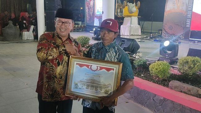 Samin (52), buruh tani asal Kampung Padawaras, Desa Kertajadi, Kecamatan Cidaun, Kabupaten Cianjur yang viral usai aksi nekatnya memanjat tiang demi kibarkan bendera Merah Putih akhirnya dipanggil ke Pendopo Cianjur dan diberi penghargaan.