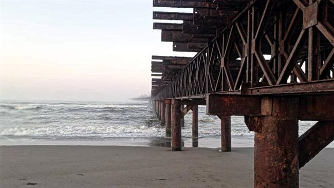 Instalasi besi sepanjang kurang lebih 800 meter menjorok dari pesisir ke arah perairan Tegalbuleud, Kabupaten Sukabumi, Jawa Barat. Jembatan itu menjadi tempat hilangnya FR alias Beta (19) saat membuat konten meloncat ke laut.