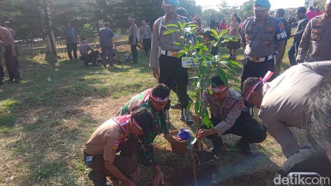 Polrestabes Bandung menanam 1.500 pohon di kawasan Sport Jabar Arcamanik, Kota Bandung, Rabu (23/8/2023). Ribuan pohon itu ditanam sebagai bentuk Polri menjaga kelestarian alam.