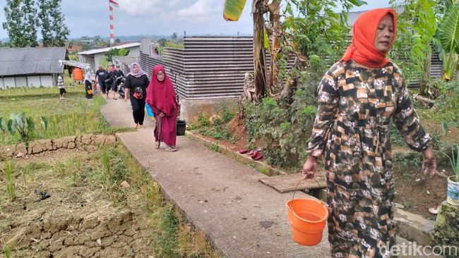"Sumur warga kering, tapi di sawah ada sumber mata air. Jadi selama kekurangan air bersih, warga mengambil air di sumur sawah yang jaraknya sekitar 100 meter," kata Memet.