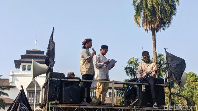 Forum Ulama Tokoh dan Advokat (FUTA) Jawa Barat, menggelar aksi damai di depan Gedung Sate (Gesat), Jalan Diponegoro, Kota Bandung, Jumat (25/8/2023). Mereka menolak pembangunan Patung Soekarno di sejumlah daerah di Jabar.