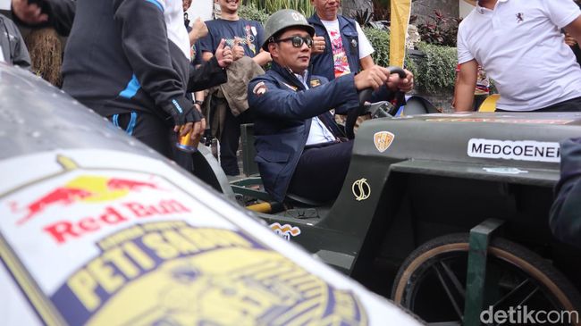 Sebelum menyaksikan perlombaan, Ridwan Kamil lebih dulu meninjau kereta peti sabun yang dipajang di area parkir Museum Geologi. Di sana, ada beragam bentuk kereta peti sabun. Kang Emil, sapaannya, juga sesekali menjajal kereta peti sabun itu dengan menaikinya.