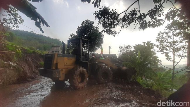 Pantauan detikJabar, Minggu (27/8/2023) sore, petugas gabungan tengah membersihkan material tanah yang menumpuk ke tengah jalan. Satu alat berat diturunkan guna mempercepat pembersihan.