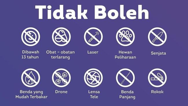 Jika ketahuan membawa barang-barang di atas, maka oleh staf keamanan akan langsung dibuang dan tidak akan ada tempat penitipan barang. Jadi, pastikan kamu tidak membawa satupun Barang Terlarang di atas.