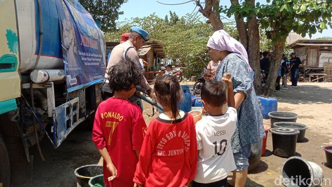 Bantuan air bersih pun menyasar blok Latar Amba, Desa Dadap, Kecamatan Juntinyuat, Kabupaten Indramayu pada Rabu (13/9/2023). Warga berkerumun sambil membawa ember untuk mendapatkan air bersih dari truk tangki air yang dikirimkan oleh Polres Indramayu.