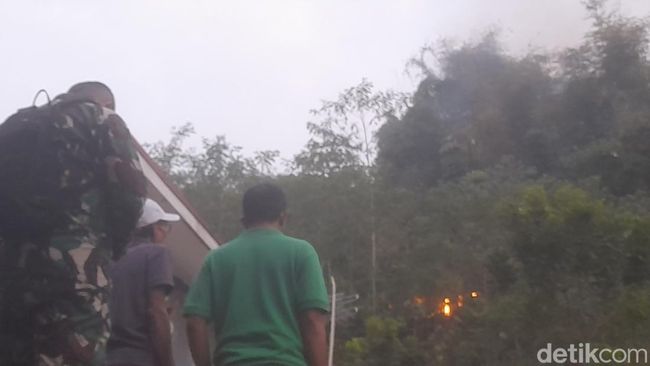 Kobaran api terlihat masih menyala di beberapa titik. Petugas BPBD Sumedang bersama personel TNI yang sudah berada di lokasi masih berupaya memadamkan api.
