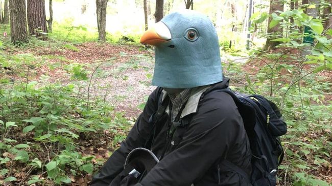 Foto tersebut diambil di sebuah hutan Prefektur Nagano, Jepang. Pria dalam topeng tersebut merupakan rekan ilmuwannya yang memutuskan untuk menyamar selama setahun penuh agar bisa mendekati sarang burung gelatik batu.