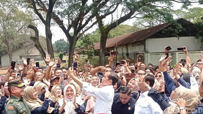 Presiden Joko Widodo (Jokowi) tampak mesra dengan Menteri Pertahanan (Menhan) Prabowo Subianto saat berkunjung di PT Pindad. Jokowi dan Prabowo pun sempat selfie atau swafoto bersama pegawai Pindad.