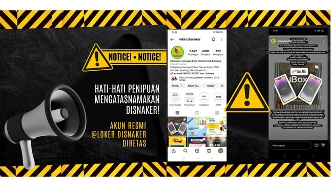"Hati-hati penipuan mengatasnamakan Disnaker. Akun resmi @loker.disnaker diretas," tulis pengumuman yang diposting Instagram @disnaker_kabbandung.