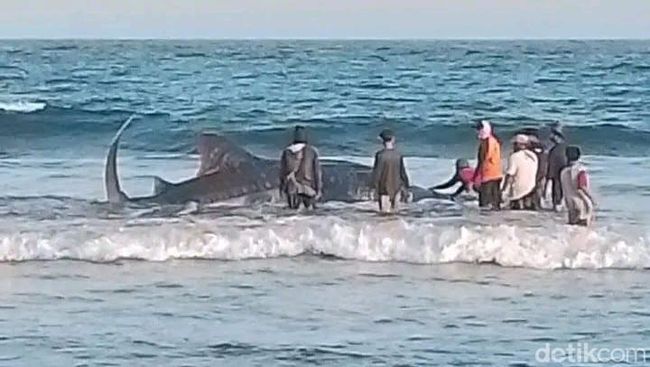 Seekor hiu tutul atau naga bentang sepanjang 8 meter terdampar di pantai Batukaras, Cijulang, Pangandaran. Hiu tersebut ditemukan warga pada Minggu (25/9/) sore pukul 17.00 WIB.