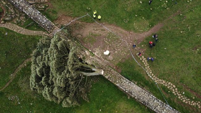 Bukan sembarang pohon. Pohon tumbang itu adalah pohon ikonik yang kerap menjadi ikon wisata di Tembok Hadrian, Inggris.