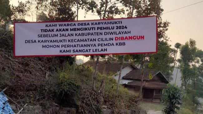 Dalam spanduk yang dipasang sejak Sabtu (30/9/2023) itu tertulis 'KAMI WARGA DESA KARYAMUKTI TIDAK AKAN MENGIKUTI PEMILU 2024 SEBELUM JALAN KABUPATEN DI WILAYAH DESA KARYAMUKTI KECAMATAN CILILIN DIBANGUN. MOHON PERHATIANNYA PEMDA KBB KAMI SANGAT LELAH'.