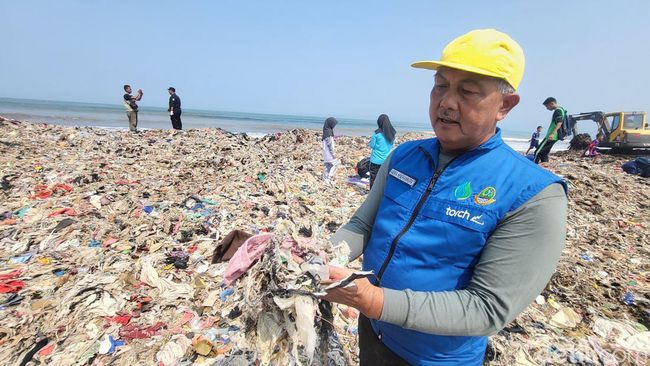 Lautan sampah menumpuk di Pesisir Loji, Kecamatan Simpenan, Kabupaten Sukabumi. Selain sampah kayu, sampah potongan kain juga mendominasi di kawasan tersebut. Kabarnya, sampah itu terbawa dari dua aliran sungai.