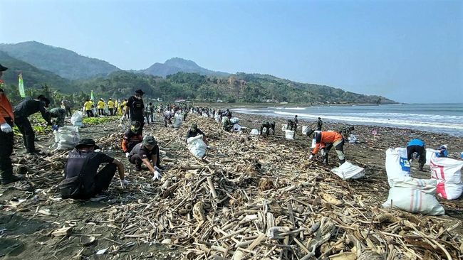 "Kita prioritaskan ke Pantai Sangrawayang sehingga kami alihkan sasaran dengan melibatkan TNI-Polri, kemudian masyarakat simpenan sendiri semua OPD ada, estimasi ada 1.300 orang yang bergabung, TNI 350 orang, Polri 150, kecamatan 570 orang ada ribuan orang ditambah ada bantuan alat berat dari PLTU," kata Anjar.