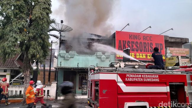 Bangunan dua lantai di area pertokoan di Jalan Prabu Geusan Ulun, Kabupaten Sumedang, Jumat (13/10/2023), terbakar. Bangunan tersebut diketahui milik warga bernama Hamid yang digunakan sebagai tempat usaha salon kecantikan oleh putrinya yang bernama Adila.