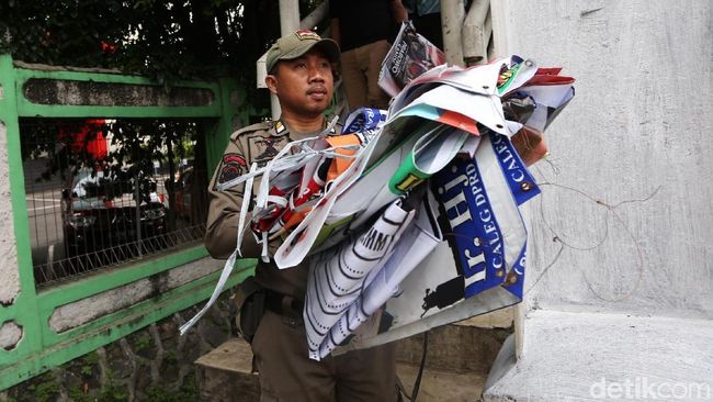 "Penertiban ini sesuai dengan perda Nomor 3 tahun 2020 tentang penyelenggaraan Ketentraman umum dan Ketertiban masyarakat, Pasal 23 ayat (1) huruf b memasang atau menempelkan kain bendera kain bergambar, spanduk dan atau sejenisnya disepanjang jalan rambu rambu lalu lintas tiang penerang jalan, pohon, bangunan fasilitas umum dan fasilitas sosial," ujar dia, Jumat (13/10/2023).