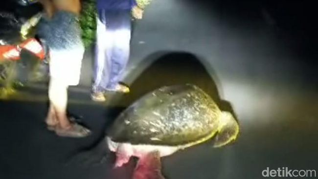 Seekor penyu hijau raksasa (Chelonia mydas) ditemukan terdampar di tengah jalan samping pantai Legokjawa, Kecamatan Cimerak, Pangandaran pada Senin (16/10) malam pukul 22.00 WIB.