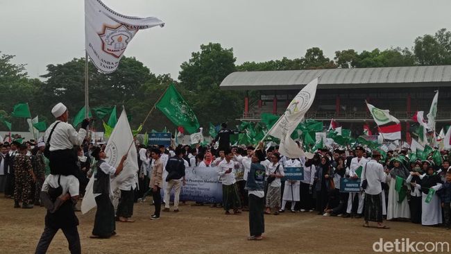 Ribuan santri dan tokoh agama dari berbagai daerah di Jawa Barat memeriahkan peringatan Hari Santri Nasional di Stadion Dadaha Kota Tasikmalaya, Minggu (22/10/2023).