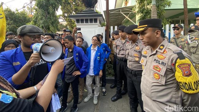 Pantauan detikJabar di halaman gedung DPRD Kota Sukabumi pukul 15:36 WIB, para massa mencoba memaksa masuk. Mereka beberapa kali mendorong gerbang namun berhasil dihadang oleh aparat kepolisian.